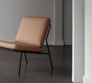 Domus Chair Steel has a black lacquered steel frame. The cushions are available in leather or fabric and sit on a classic braiding of tanned leather.