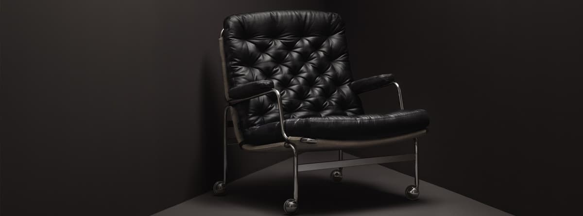 Iconic easy chair designed by Bruno Mathsson. The Jetson chair reflects both his obsession with comfort and a classic Swedish modern design approach. It features a bowl-shaped seat, ergonomically designed high back with head pillow. Chrome swivel base with a unique self-return mechanism.