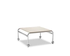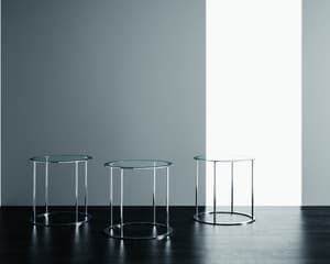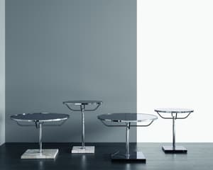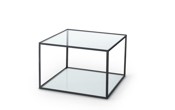A classic table with a square shape in chrome or black metal, with a glass top and bottom.
