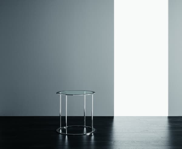 A classic round table in chrome, with manual height adjustment and a marble base.