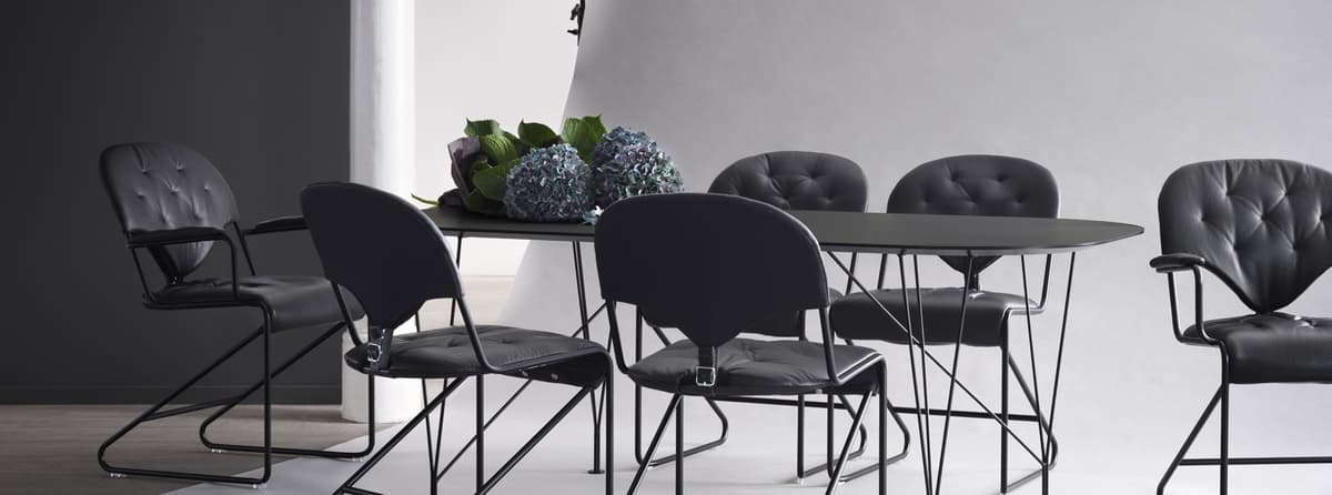 Oval dining table that encourages conversation and eye contact with all guests. Also available in two more versions, a dining table with two extendable tops and a smaller café table size.
