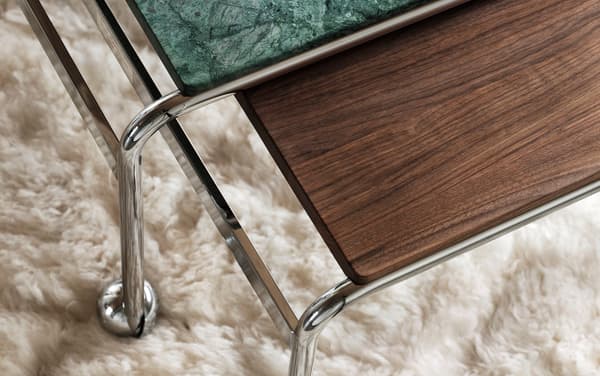 Based on Bruno Mathsson’s original table, designed to accompany his classic chair, this slightly larger option provides more surface space with the same elegant aesthetics of the Karin collection. The chrome-plated frame is topped in exclusive marble or walnut.
