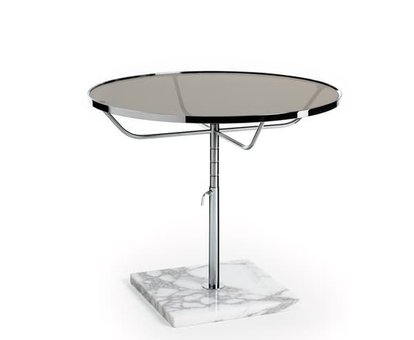 A classic round table in chrome, with a larger top diameter than its smaller counterpart. Featuring manual height adjustment and a marble base.